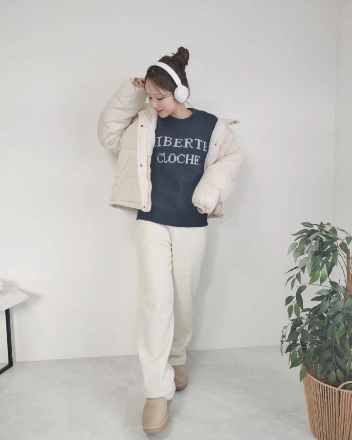 こちらは、甘さとカジュアル感が絶妙なバランスのコーディネート。淡いカラーのジーンズと優しい雰囲気が漂うベージュのムートンスリッパは相性抜群!