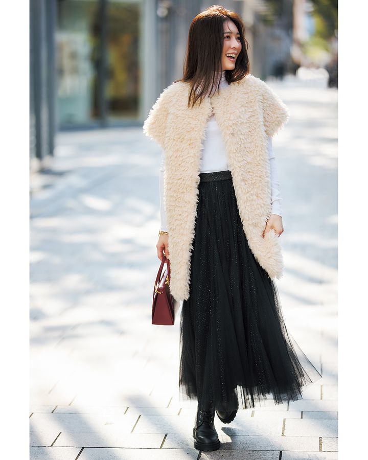 半袖ファーコート¥32,450(シンクファー)ニット¥5,990(アンフィーロ/アンフィーロ〈オンワード樫山〉)スカート¥25,300(ジャスグリッティー)バッグ¥20,900(アドカラム/アンソロジー)シューズ¥34,100(ダイアナ/ダイアナ 銀座本店)ブレスレット¥6,600(エイチアッシュ/フォーティーン ショールーム)