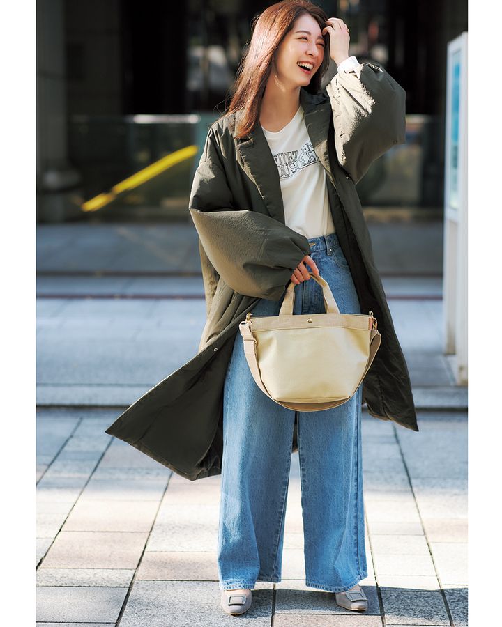 バッグ¥9,900(ウイトート コウベ)コート¥64,900(カーサフライン/カーサフライン表参道本店)カットソー¥4,990(アンフィーロ/アンフィーロ〈オンワード樫山〉)パンツ¥33,000(yori)シューズ¥17,600(ダイアナ/ダイアナ 銀座本店)