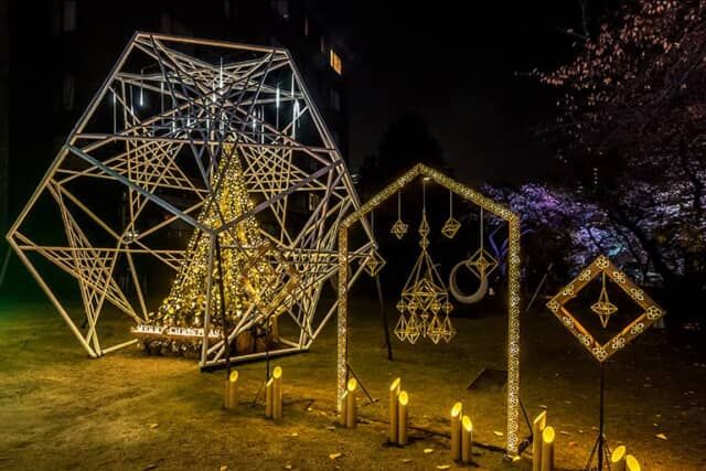今回は竹あかりとヒンメリを組み合わせ、日本と北欧の文化がマリアージュ。本来は麦藁で作られるヒンメリですが、屋外に展示するため、真鍮のパイプで作られています。
