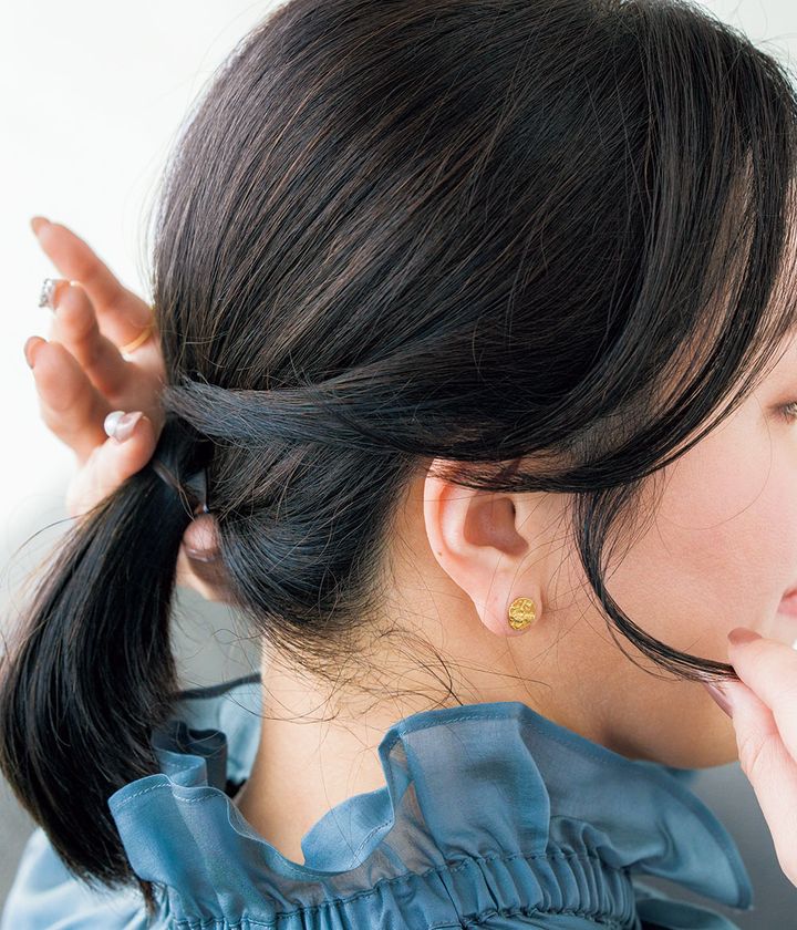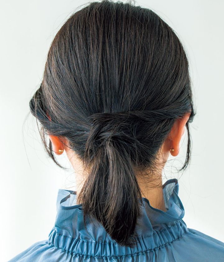 あえて残したおくれ毛で、黒髪を結んでも地味さを回避。