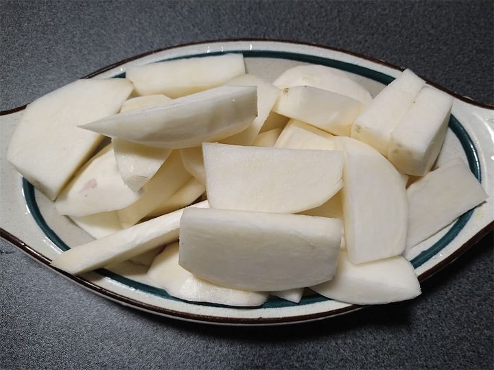 1.かぶは皮を剥いて、2cm幅のくし切りにする。