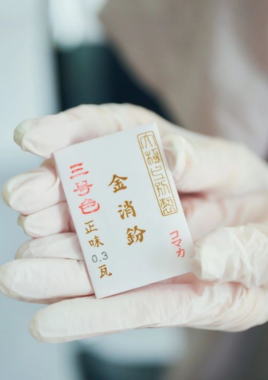赤い弁柄漆を細い筆で塗り、金粉を付けたシルクのパフで丸を描くようにやさしく蒔いていく。