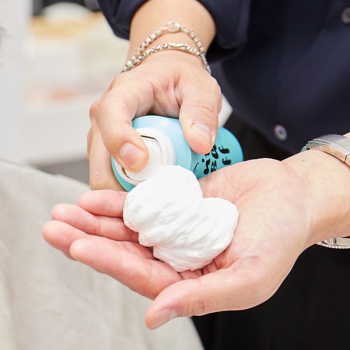 スタイリング前にネジュさんのヘアケアブランド「ネジュ(Néjoo)」の「ドントウォッシュトリートメント」をロングなら卵2個分程度を使用しなじませ、アホ毛などを落ち着かせたら分け目の癖をチェック。ボリュームが少ない側をストレートアイロンで立ち上げて整えていきます。