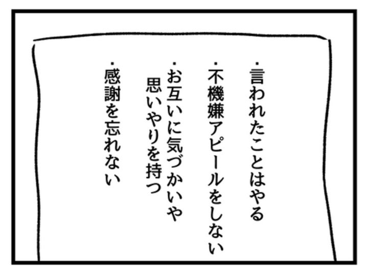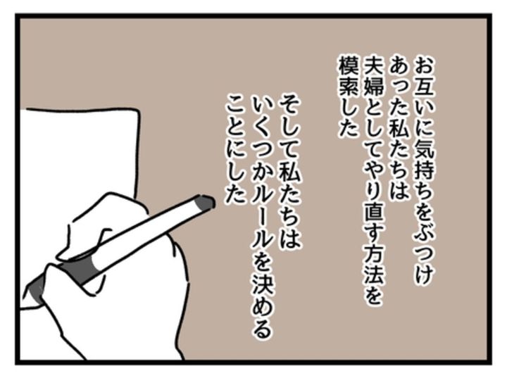 お互いのストレスが減るよう、ルールを決めた2人。すぐに変わるのは難しいものの、お互いの本心を知ったあとはすっきりした気持ちになったようです。一緒に暮らす夫婦だからこそ、価値観の共有はとても大切なこと。夫婦とはいえ言わなくては伝わらないことがあるという前提で、問題を解決する話し合いができるといいですよね。