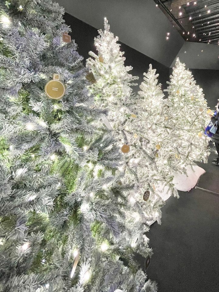 会場内の白く輝くモミの木には