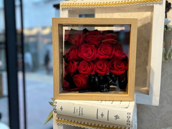 真っ赤なバラの花束、とても綺麗です!花束をプレゼントして後日、飾れるようにボックスに入れることもできるそうです。お部屋に思い出を飾れるなんて素敵ですね!