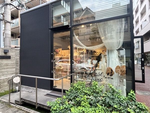場所は、福岡市中央区大名、様々なお店が立ち並ぶ西小姓町通りの一角にあります。外観からお洒落でスタイリッシュなお店♪ こちらは「プリザーブドフラワー専門店ROSEJUNO‐ローズユノ‐」さんです。 さっそく中へ入ってみましょう。