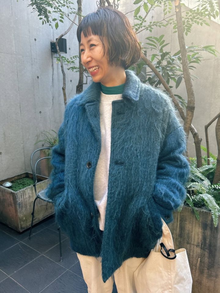 「一昨年前のシーズンのものですが、直感で長く愛用できそうと思い展示会でオーダーしました。上質なキッドモヘアならではのシャギー具合、しかも裏地はキュプラ。さらに流し染め技法で色づけられた表情のあるブルーに魅せられて手に取り、袖を通したら、軽いのに保温力も十分。ERiKOKATORiならではの妥協のないモノづくりを感じられる一枚です」エリコカトリのコートは本人私物