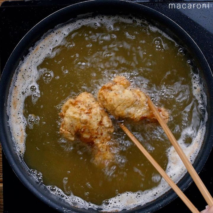 6: 160℃の油で5分ほど加熱します。180℃で1分ほど加熱して完成です。