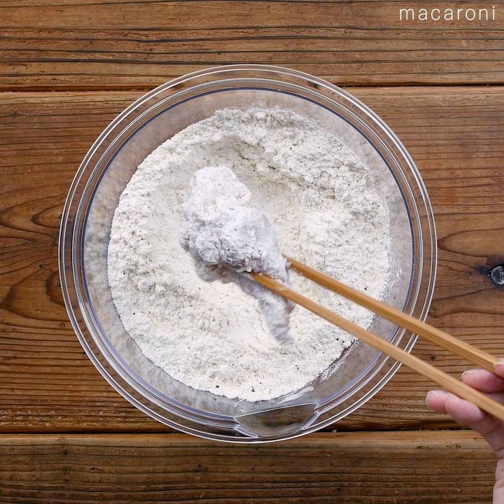 2度衣を付けることで、カリッとした食感が生まれます。衣をしっかり押さえながらつけてください。