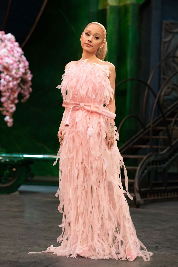 アリアナが演じる南の魔女、グリンダのシグネチャーカラーであるピンク。リボンをデコラティブに重ねたバレンシアガのピンクドレスは、花嫁のお色直しやパーティにいかが? ウエストでキュッと結ばれたリボンもキュートさ満点です。
