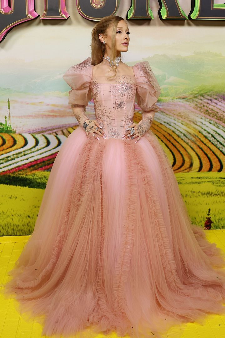 2024年11月、『ウィキッド ふたりの魔女』のヨーロッパツアーでまとったパステルイエローのドレスは、ラルフ ローレンのもの。軽やかな素材感、デコルテや腕周りを包み込むショール風のデザインが優美なムードを漂わせています。
