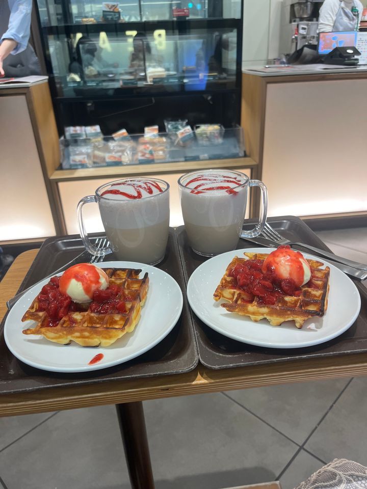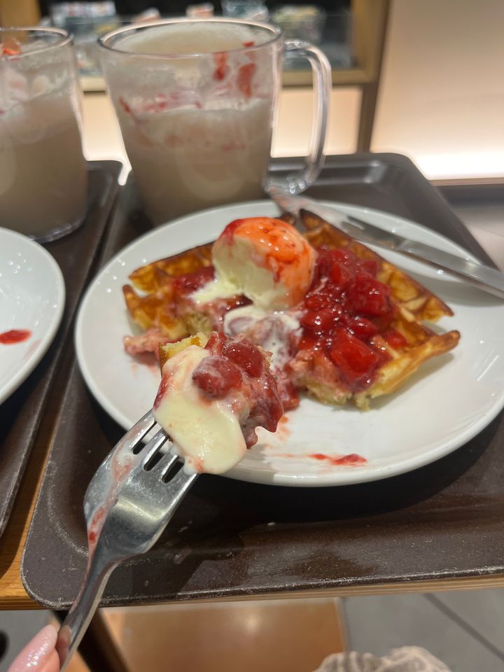 ワッフルはもっちりとしていて、冷たいアイスとたっぷりのいちご果肉と相性抜群!
