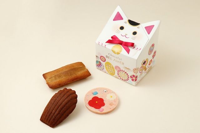 福を招いてくれそうな招き猫のパッケージに入っているのは、梅の花が可愛いピンクの「梅フレーズ」とチョコレートを使った焼き菓子2種。見た目に可愛いボックスはプチギフトに喜ばれそうですね。
