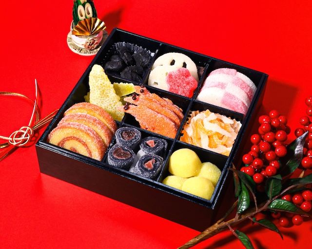 一見、よくあるおせちに見えるこちらは、なんとほとんどがグミでできたお菓子のおせち。食感の違うグミや、ナッツチョコの黒豆などが入って、飽きずに食べられます。みんなで食べれば、その場の話題を独り占めできちゃうこと間違いなしですよ。