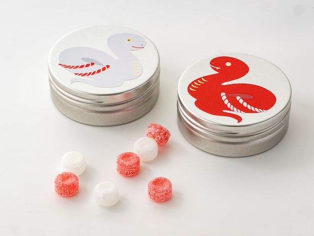 縁起のよいキャンディシリーズ2025年の干支「へび」バージョン。紅白がおめでたい、小粒アップル味とヨーグルト味の2種アソートです。白へびも紅へびも、両方そろえたくなってしまう可愛さ!