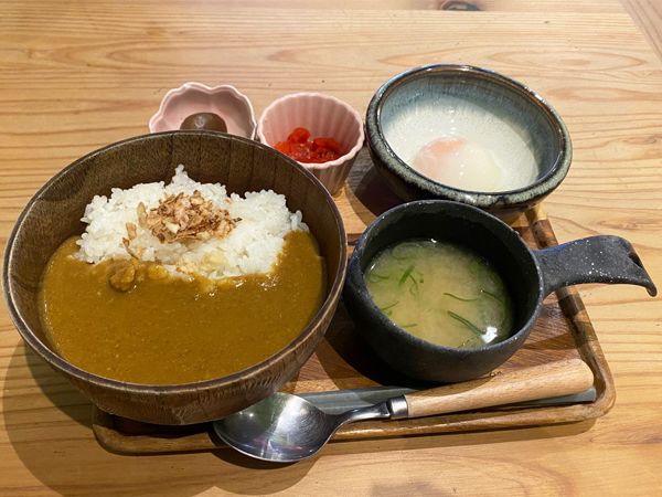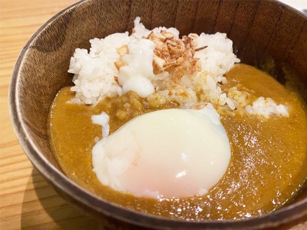 おわんカレーは、見た目家で食べるようなカレーに見えますが、しっかりとスパイスを使った、よそいきのカレーの味。トッピングのフライドオニオンの食感と風味も楽しい。またおんたまをくずしながら食べれば、黄身のコクが良い味変になりました。