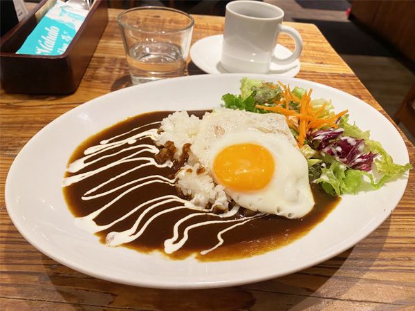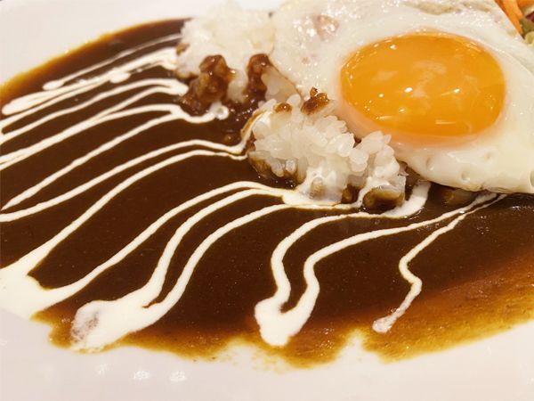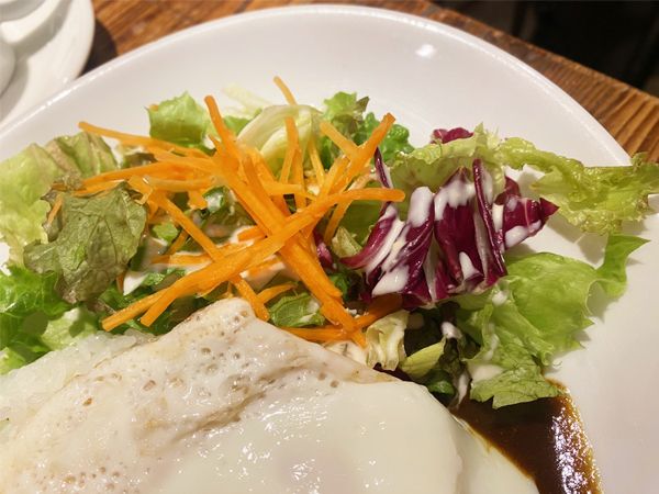 付け合わせの目玉焼きと一緒に食べれば、白身の香ばしさや黄身のコクがアクセントになって、さらにスプーンが進みました。サラダとカレーの組み合わせもイケました。