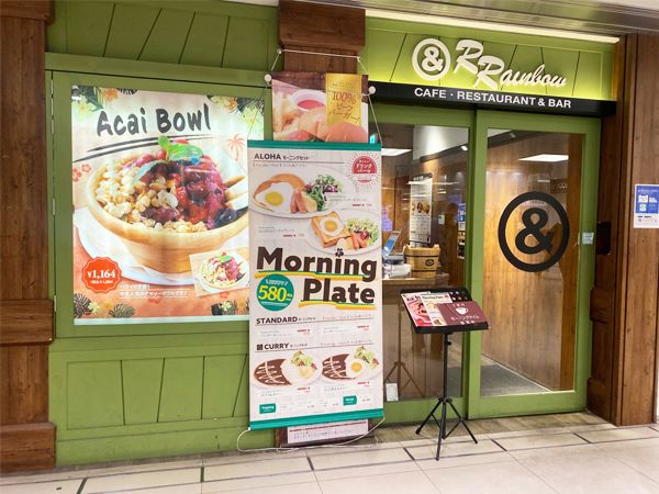 横浜駅西口の地下街「ジョイナス」地下1階にある、「&RRainbow(アンドダブルレインボー)」。ハワイアンのテーストが感じられる空間で、パンケーキやアサイーなどが楽しめるハワイアンレストラン&カフェバーです。