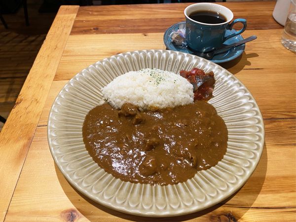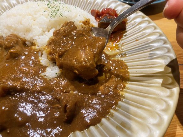 カレーは、牛すじ肉がたっぷり。とろりと濃厚なカレーはスパイスと野菜や肉のうまみが溶け込んだ味わい深いテーストです。食べ始めは甘さが勝っていましたが、ジワジワと辛くなるカレーでした。