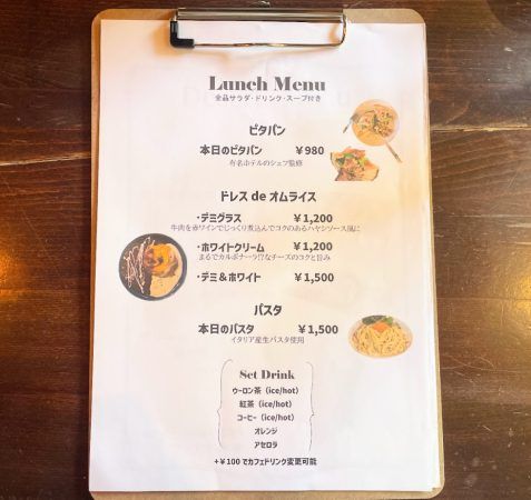 ランチメニューは赤ワインで煮込んだデミグラスソースのオムライスのほか、チーズのコクが決め手のホワイトクリームのオムライス、そしてイタリア産の麺を使用したパスタなどがありました。 どれも美味しそうで迷いますね~!
