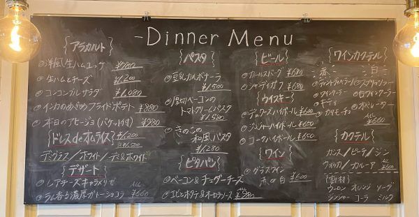 こちらはディナーメニューです。 夜はパスタのメニューが増え、厚切りベーコンのトマトクリームパスタや、和風きのこパスタなど。ワインやカクテルのメニューも豊富です。女子会にもいいかも♪