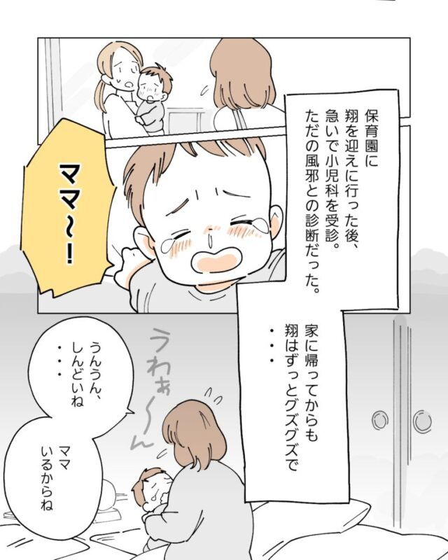 保育園に翔くんを迎えに行き、急いで小児科を受診したちひろさん、翔くんはただの風邪と診断されたものの、家に帰ってからもグズグズしていました。「ママ~!!」そう言って泣く翔くんを抱っこしながら、「うんうん、しんどいね・・ママいるからね」と翔くんを優しくあやしました。