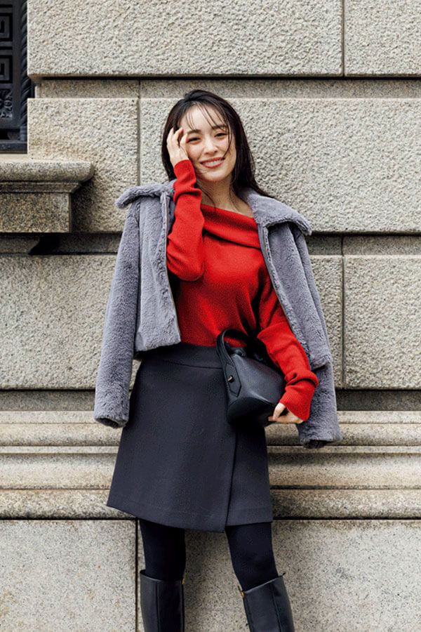 赤ニット×ラップミニで、真冬のワンツーコーデをイマドキに更新!
