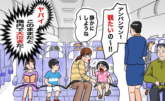 長女、長男、次女を連れて、飛行機に乗り実家へ帰るときのこと。子どもたちにとって初めての飛行機でした。タブレットで観たいものが観られない、スマホも使えないという状況に、次女がグズってしまいました。飛行機の中で騒がれてしまい、私は焦ってしまいました……。