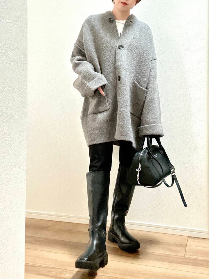ヒップまで隠れる絶妙な着丈を味方に旬なロングブーツとの合わせを楽しむ
