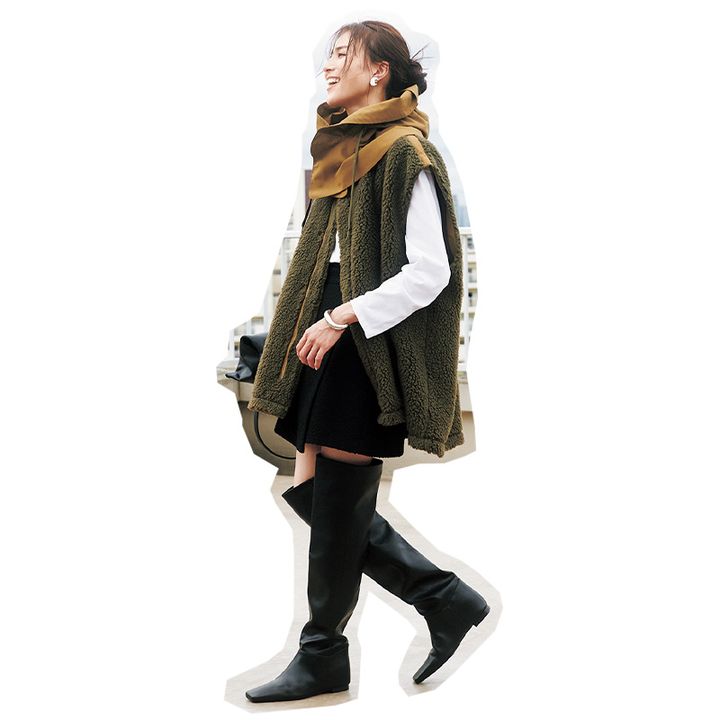 ニーハイブーツ[H1.5cm※インヒール除く]¥17,930(ミラ オーウェン/ミラ オーウェン ルミネ新宿2店)ボアベスト¥71,500(ヴァシュモン×カオス/Chaos GINZA SIX)カットソー¥12,100(マルティニーク/マルティニーク ルミネ横浜)ミニスカート¥18,700(アルページュストーリー)イヤリング¥14,300(イリス 47/フーブス)バングル¥13,750(エイチアッシュ/フォーティーン ショールーム)バッグ¥46,200(PUNTI./エルディスト)