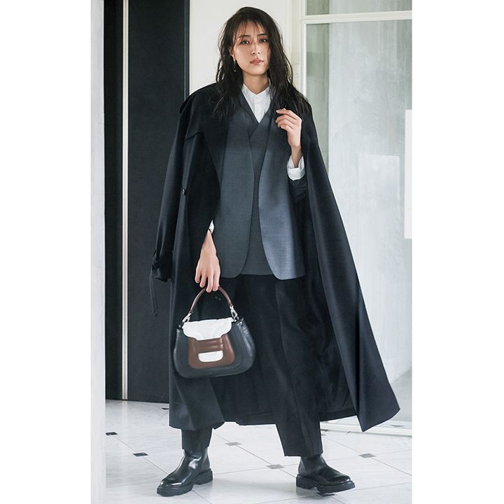 ブーツ[H4cm]¥48,400(Luca Grossi/セオリーリュクス)ロングコート¥121,000(ハイク/ボウルズ)ジャケット¥42,900ジレ¥30,800(ともにエディション/エディション 表参道ヒルズ店)シャツ¥23,100(エリオポール/エリオポール代官山)パンツ¥49,500(キャバン/キャバン 丸の内店)ピアス¥33,000(ブランイリス/ブランイリス トーキョー)バッグ¥193,600(ピエール アルディ/ピエール アルディ 東京)