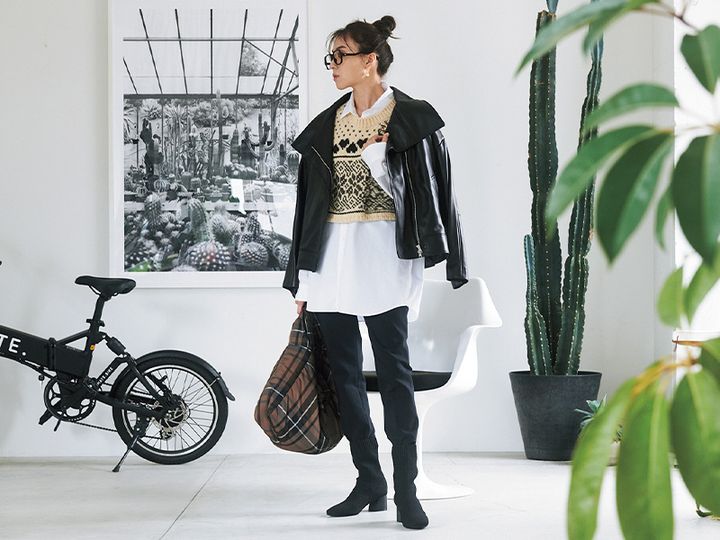 ブーツ[H4cm]¥22,000(クムウ_ダイアナ/ダイアナ 銀座本店)レザージャケット¥242,000(デ・プレ)ニットベスト¥41,800〈ジェーンスミス〉バッグ¥35,200〈コキヨ〉(ともにアダム エ ロぺ)シャツ¥36,300(ATON/エイトン青山)パンツ¥22,000(ル フィル/ル フィル ニュウマン新宿店)メガネ¥58,300(アイヴァン 7285/アイヴァン 7285 トウキョウ)ピアス¥26,400(モニス/フォーティーン ショールーム)