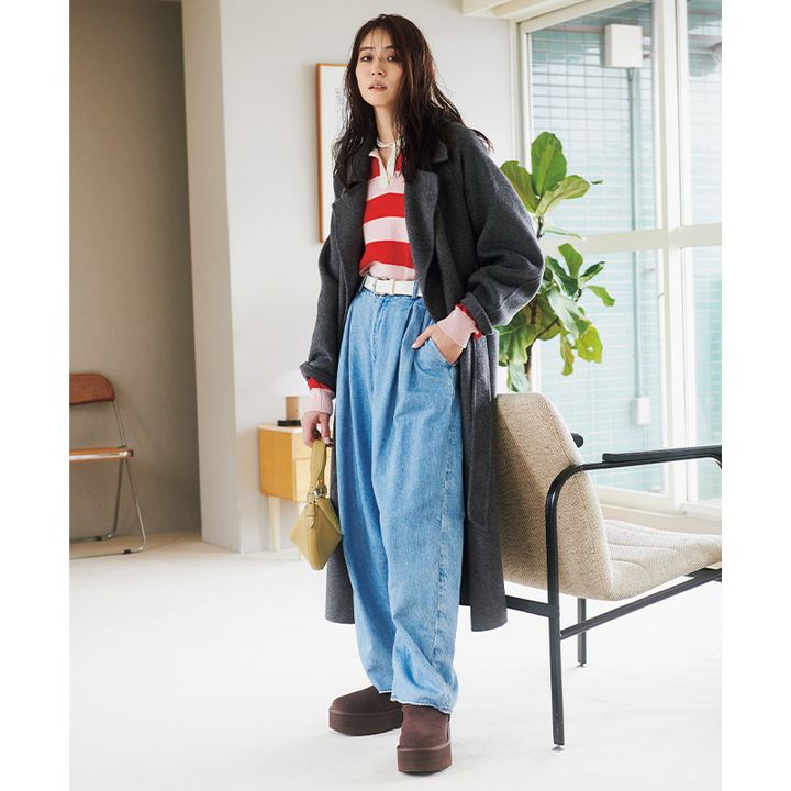 [Classic Ultra Mini Platform]ブーツ[H5cm]¥25,300(UGG®/デッカーズジャパン)コート¥94,600(ロンハーマン)ポロニット¥75,900(アンドドーター/RHC ロンハーマン)デニムパンツ¥39,600(サードマガジン)パール×赤糸ネックレス¥14,850〈エイチアッシュ〉パールネックレス¥19,800〈モニス〉(ともにフォーティーン ショールーム)バッグ¥115,500(J&M デヴィッドソン/J&M デヴィッドソン カスタマーセンター)ベルト¥15,400(ギャルリー・ヴィー/ギャルリー・ヴィー 丸の内店)