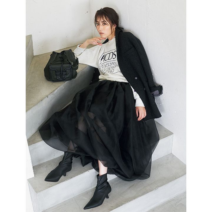 ポインテッドブーツ[H4.5cm]¥49,500(ペリーコ サニー/アマン)スウェットトップス¥14,300(チャンピオン フォー アダム エ ロぺ/アダム エ ロぺ)スカート¥61,600(THE GARMENT/メゾン イエナ)ジャケット¥93,500(サードマガジン)ネックレス¥44,000(ビジュードエム/ビジュードエム伊勢丹新宿店)バッグ¥193,600(ピエールアルディ/ピエール アルディ 東京)ペチコート/スタイリスト私物
