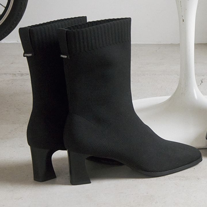 安定感のあるプレートヒール×スクエアトウで今どきに。 ニットブーツ[H5.5cm]¥15,400(ル タロン/ル タロン 有楽町マルイ店)