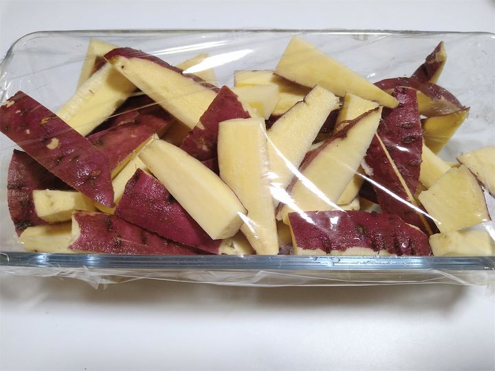 2. 1のさつまいもの水気を切って、耐熱皿に入れる。ラップをかけて、600Wの電子レンジで4分加熱する。