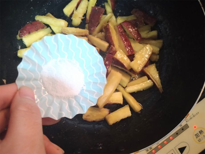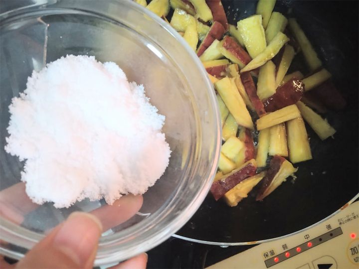 混ぜ過ぎるとさつまいもが崩れてしまうので、やさしく炒めましょう。
