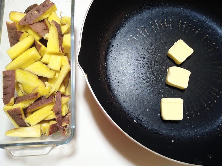 3. フライパンを熱してバターを溶かしたら、加熱したさつまいもを入れて軽く炒める。
