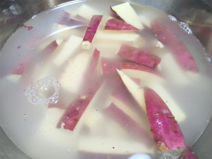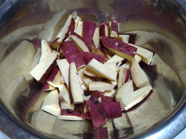 1. さつまいもは皮付きのまま、短めの拍子木切りにして水にさらす。