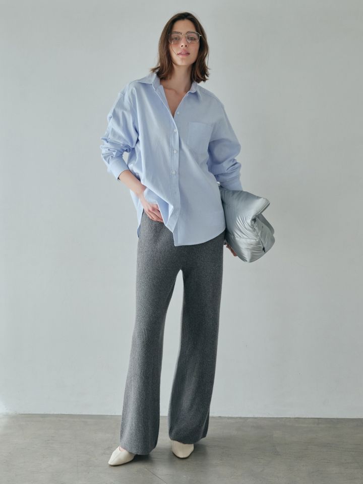 チャコールグレーニットパンツ、ブルーオックスフォードシャツ (オンライン限定商品) /すべてGap すっきりとしたハイウエストから足先まですらっと伸びる美脚シルエット。おまけにすそがすぼまっていないから、ポインテッドトゥパンプスともキレイに合わせられる。