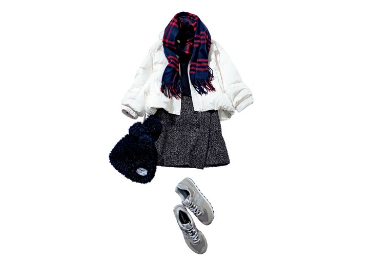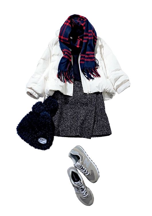 ショートダウンジャケット¥24,970/LILY BROWN(LILY BROWN ルミネエスト新宿店) タートルニット[一部店舗のみで販売]¥9,990/UNIQLO ツイードセットアップ(スカパン)¥18,700/アルページュストーリー ボアバッグ¥12,100/スリードッツ(スリードッツ表参道店) スニーカー¥11,990/ニューバランス(ニューバランスジャパン) チェックストール¥16,500/アンタイトル