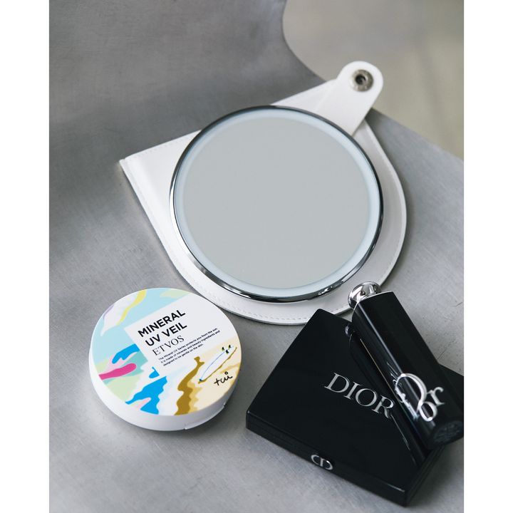 ディオールのアイシャドウやリップ、日焼け止めパウダーファンデーションと、シンプルヒューマンの3倍拡大鏡は必ず持ち歩いています。自宅では同じ拡大鏡の10倍を愛用。