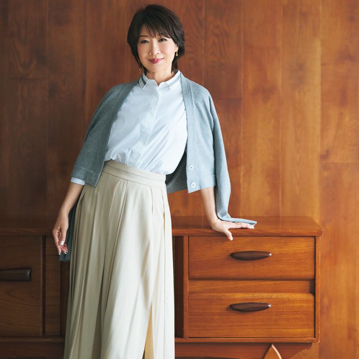 普段は簡単ですが、毎日メイクをします。ファンデーションは軽いタッチが好きで、カバーマークのコンシーラーとエトヴォスのミネラルUVベールⅣのフェイスパウダーのみで、時々リキッドファンデーションを。アイメイクは長年ディオールショウ サンク クルール539の5色アイシャドウを。中央の黒をぼかすと目もとが引き締まり、ナチュラルに描けます。アイラインとアイブロウペンシルはケイト。まつ毛はエクステをしているのでノーマスカラ。チークはルナソル、リップはディオール アディクト リップスティック418が気に入っていて、ずっと使っています。これからの季節はカサカサしてくるのでボディクリームは欠かせません。またまた(ヘア・メイクの)黒田さんに教えていただいたロクシタンのブルー缶、シア リッチボディクリームを使い始めたら、しっとりするようになりました。
