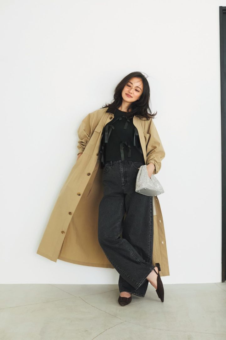 キレイめに振れる黒一択!マニッシュ寄りな最旬デニムがあれば、STORY世代はもう最強! カーヴィのモードさがリボンの甘さを調節。下半身にボリュームがある分、トップスは少しコンパクトにまとめると好バランスに。インナーは黒でつなげて上品な印象を作り、カジュアルなコートをさらっとON、これぞまさに大人のハズし方。季節によっては、羽織ものを変えてみて。