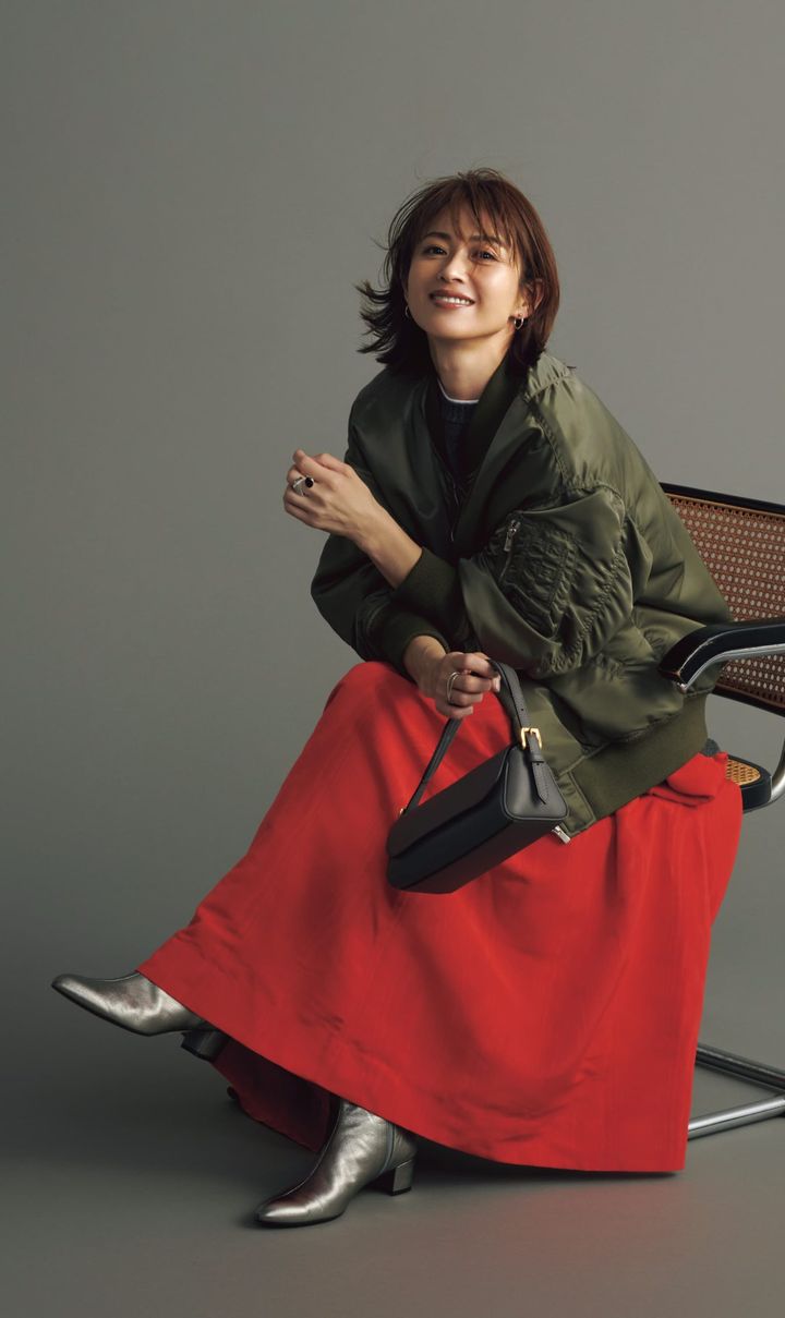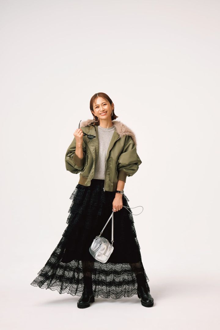 フェミニンなドラマティックなスカートはMA-1で大人っぽく昇華。量感のあるティアードスカートは短か丈ブルゾンでバランスよくまとまる。甘さを抑えてくれるミリタリージャケットは保温性もあって寒い日には心強いアイテム。シルバーバッグも差し色になっていて⚪︎。