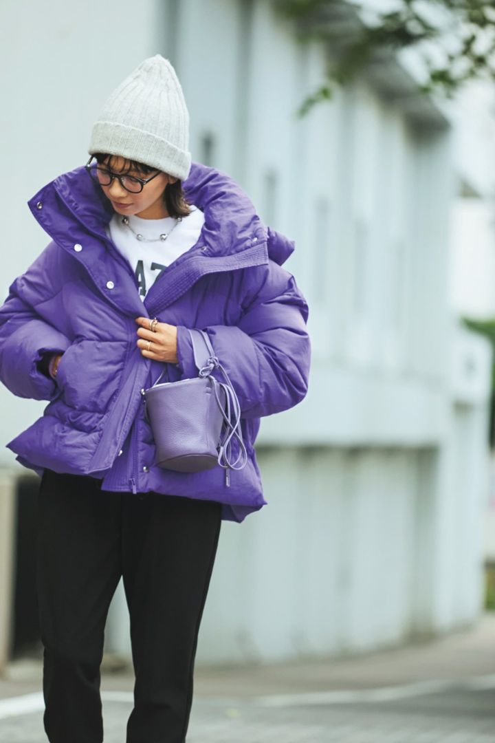 暗くなりがちな冬も元気が出るビビットなパープルのダウンをチョイス。外出時には、短すぎずお尻が隠れる丈感を選んで防寒もバッチリ。ネックレスでカジュアルムードを引き締めるのがポイント。バッグともカラーを統一して全体のコーデの完成どんも上がること間違いなし!ボリュームの出るアウターもドロップショルダーにして女性らしいフォルムに。