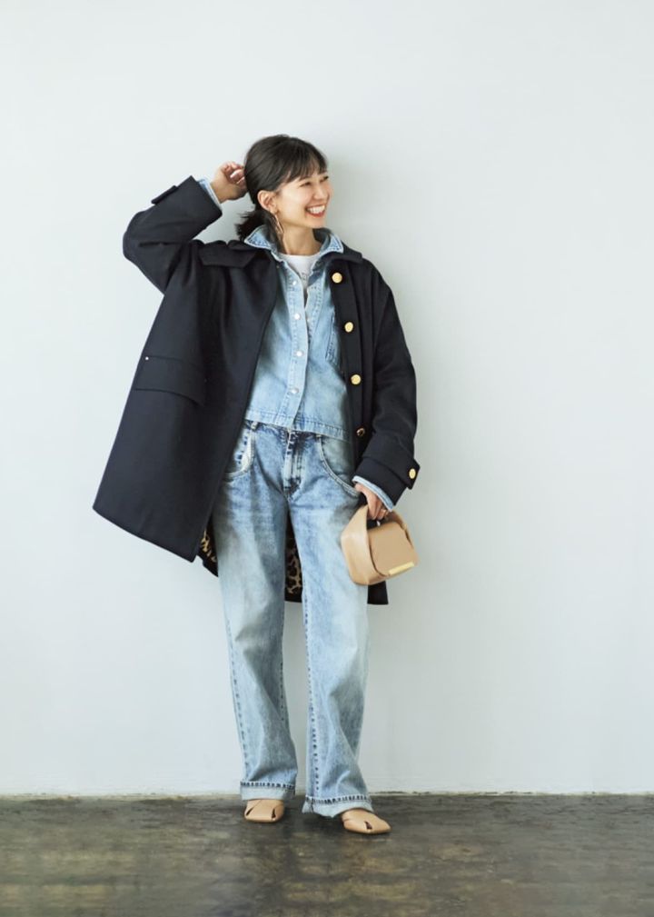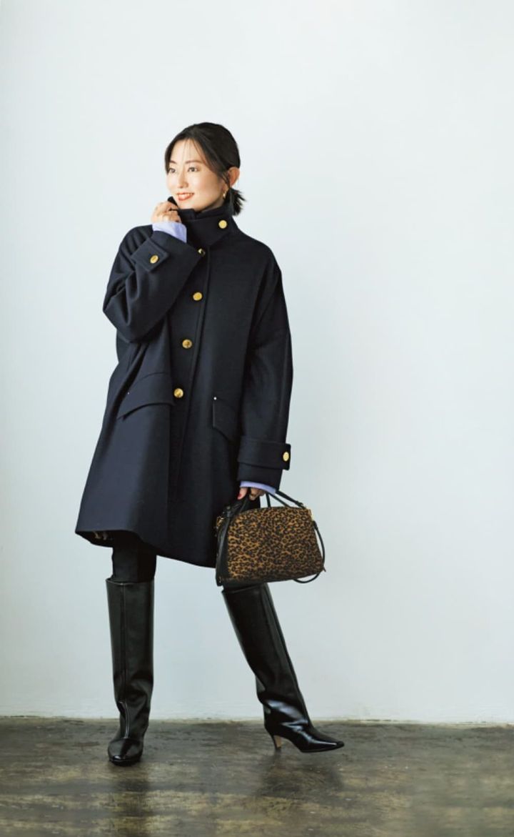 シンプルながら金ボタンが高級感があって魅力的。防寒対策にもなるブーツをインしたトラッドな着こなしが今っぽくて⚪︎。豹柄のショルダーバッグが統一感のあるコーデにアクセントを与えてくれる。寒暖差のある日には、マフラーとも合わせてみて。
