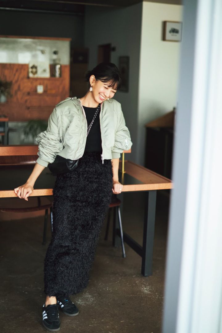 主張しすぎないカーキのMA-1。腰位置高めの丈感でスタイルアップ効果絶大。優しげな色味のカーキなので男前にならず逆に可愛く見えるのが高ポイント。防寒性の高いMA-1とオール黒のスカートコーデは寒い日のお出かけにピッタリ。ライトなカラーでもミリタリージャケットだから甘くない。